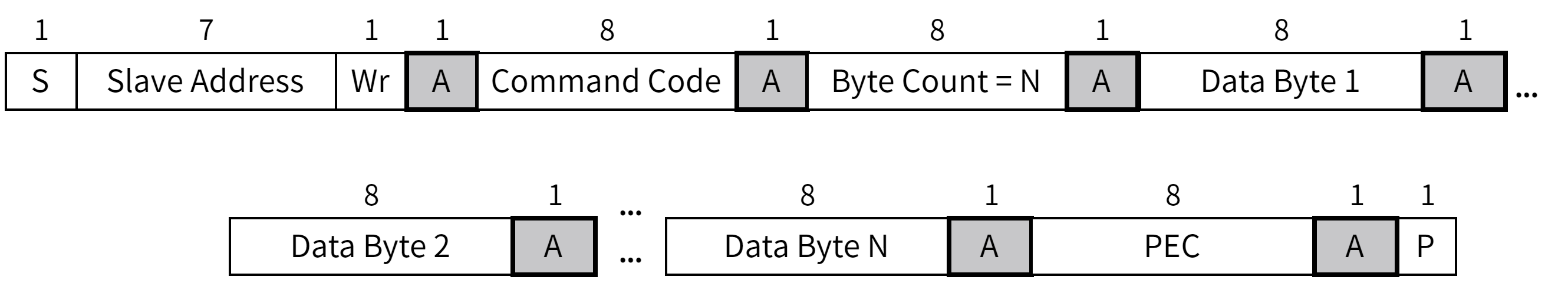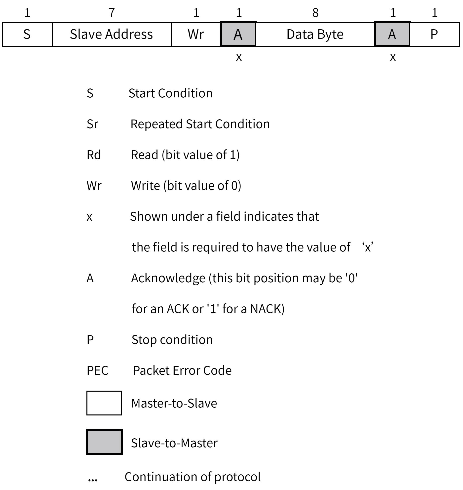 SMBus格式中,白色的框是Master发送的数据,阴影部分是Slave发送的数据。