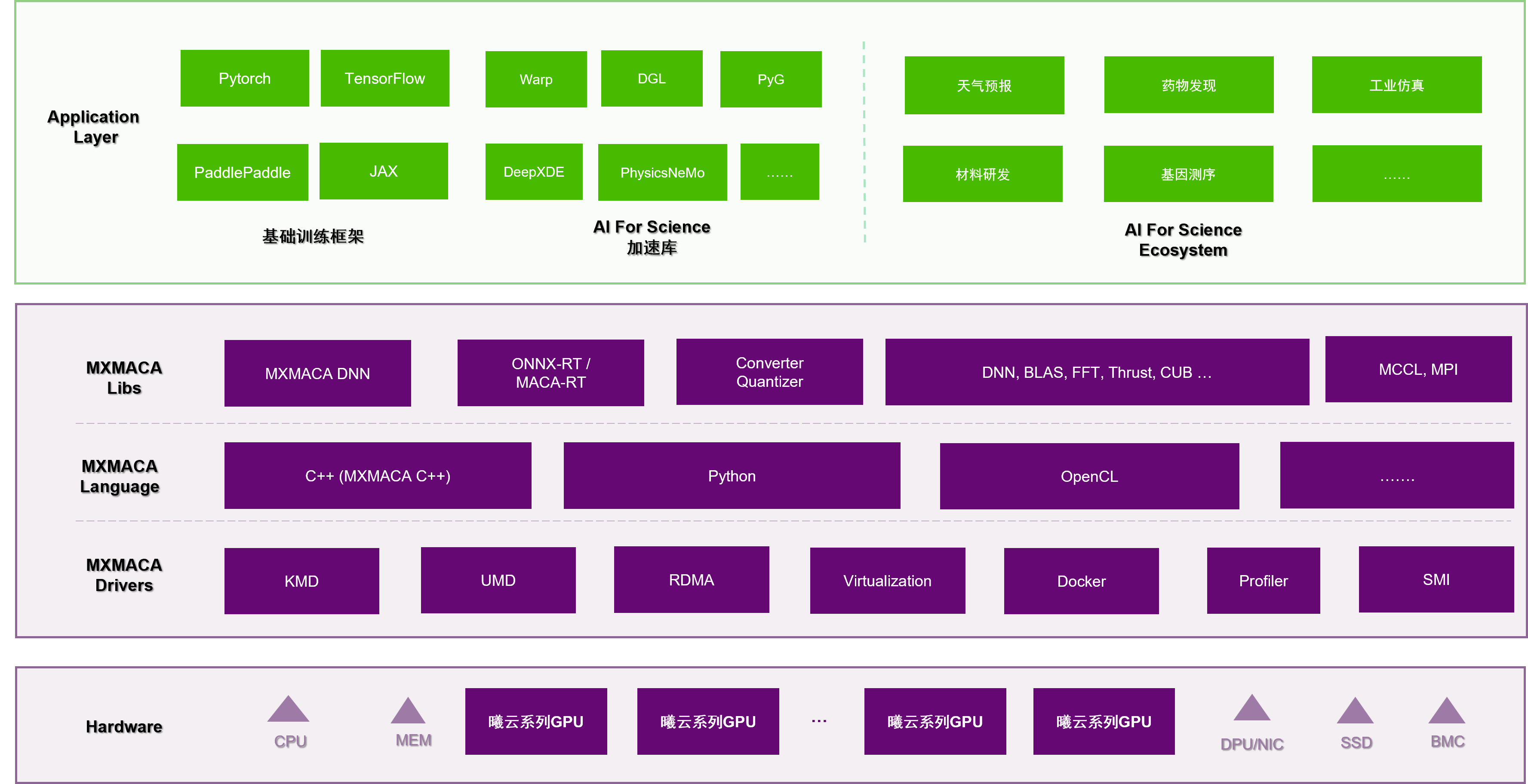 在整个MXMACA软件栈中,不可或缺的基础设施是硬件底座。硬件底座提供了算力保证,亦是作为特定场景下面的加速器来使用。