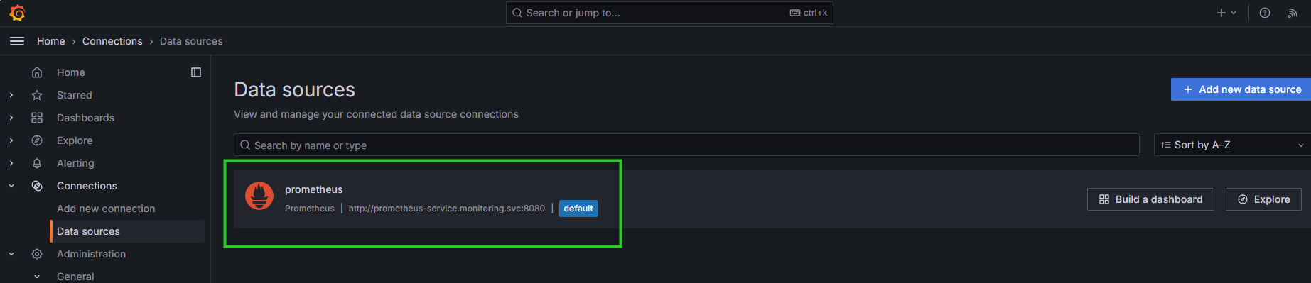 默认已添加Prometheus,若未添加可点击右上角Add new data source,选择添加Prometheus。之后点击 prometheus 进行配置,如图 6.2 所示。
