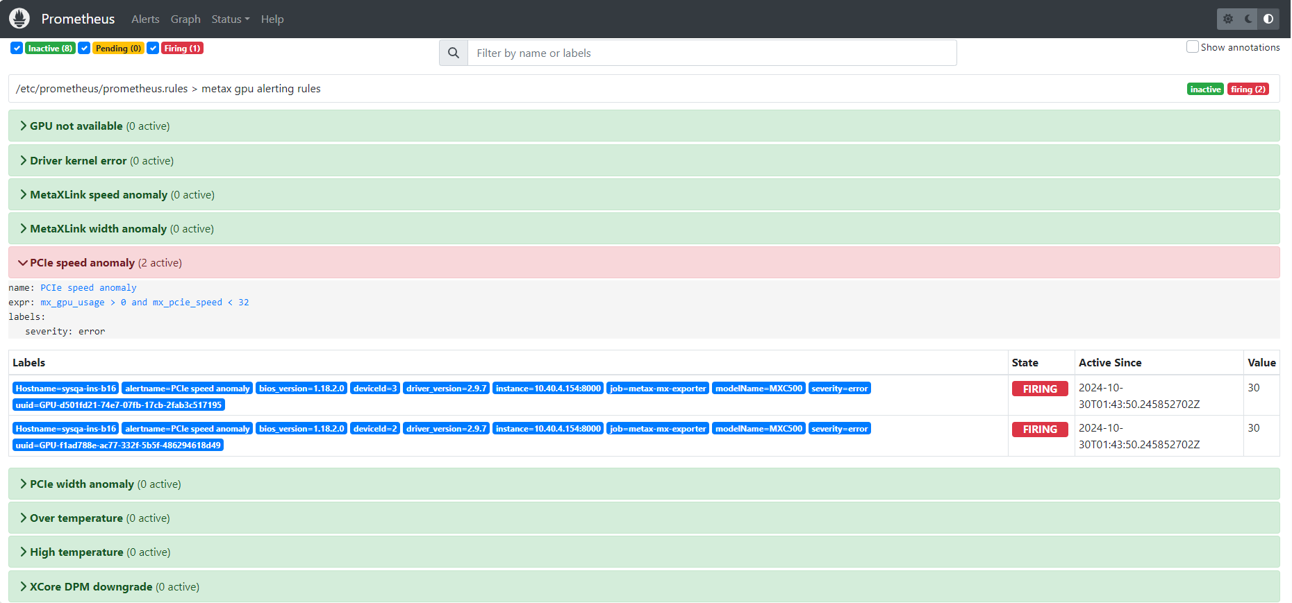 如图 7.1 所示,可以看到规则 metax gpu alerting rules 中定义的告警列表。