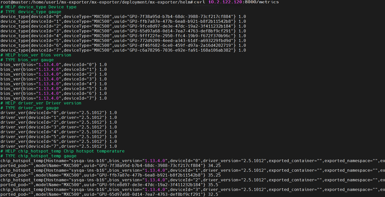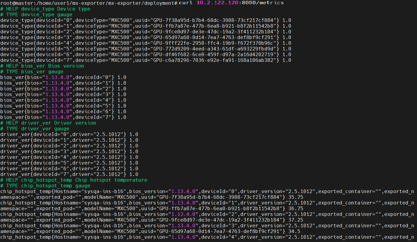 mx-exporter部署成功后,等待40秒,可在k8s中用 curl 命令查看mx-exporter抓取的GPU信息,回显信息如图 3.3 所示。
