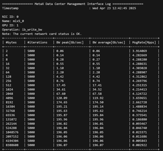 ============= MetaX Data Center Management Interface Log ============= Timestamp : Wed Mar 6 15:00:00 2024 +----------+--------+----------------------------------------------------------+ | BOARD_ID | GPU ID | Device Information | +----------+--------+----------------------------------------------------------+ | 0 | 0 | Name: MXC500 | | | | PCI Bus ID: 0000:4f:00.0 | | | | Device UUID: GPU-dcf2c6b3-bf23-7535-8406-fa0d793df737 | +----------+-------------------------------------------------------------------+ | 1 | 1 | Name: MXC500 | | | | PCI Bus ID: 0000:50:00.0 | | | | Device UUID: GPU-1323796f-71df-ea8c-ed3d-8389dbd9eef4 | +----------+-------------------------------------------------------------------+