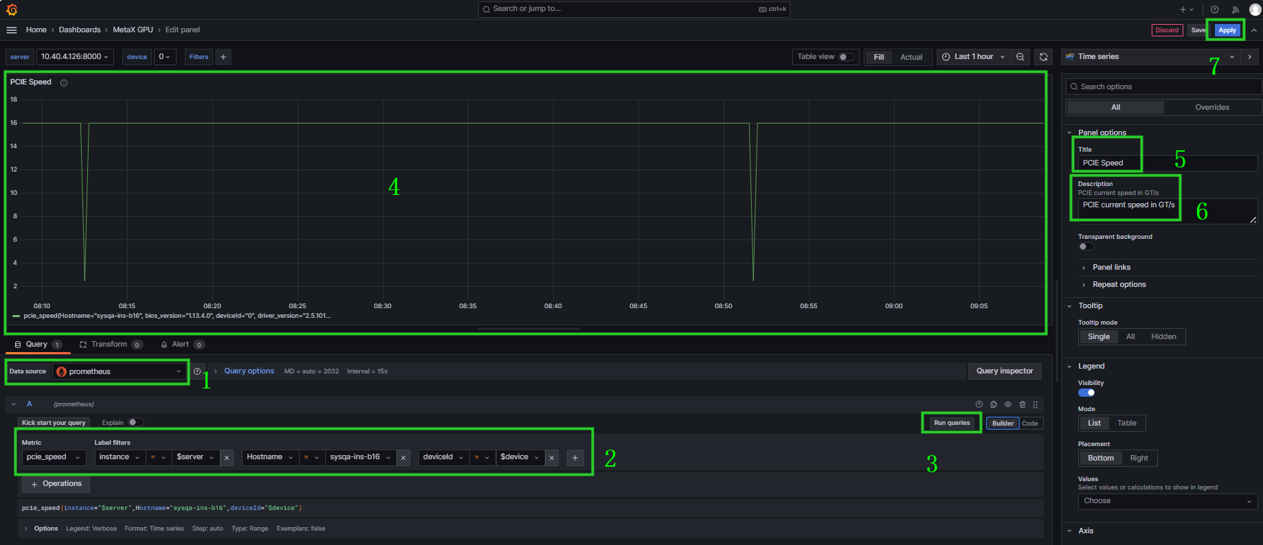 查看 mx-exporter/config/default-counters.csv 中的指标信息,根据实际情况在Grafana中添加想要监控的指标,如 pcie_peed。