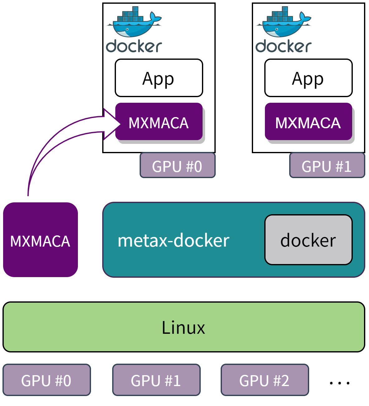 曦云系列GPU提供的metax-docker工具,是基于官方Docker的扩展工具,用于解决GPU选择过程繁琐以及应用镜像体积庞大的问题。 用户可独立发布不包含 MXMACA® 软件栈的容器镜像,并借助metax-docker工具在运行时获得一个完整的运行环境。