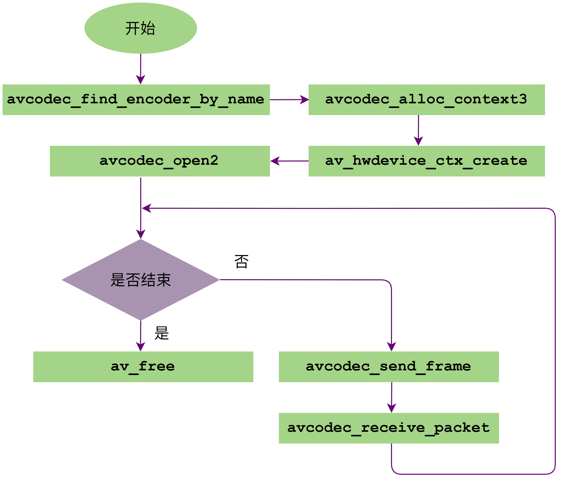 avcodec_alloc_context3:获取编解码器上下文信息。av_hwdevice_ctx_create:初始化相关硬件设备,只需要输入硬件名称 mx 就可以初始化硬件设备。avcodec_open2:调用Init函数,初始化编码器。avcodec_send_frame:将需要编码的Frame数据发送到FFmpeg编码队列中。avcodec_receive_packet:从成功编码的包队列中获取一帧Packet数据。av_free:释放编码器。