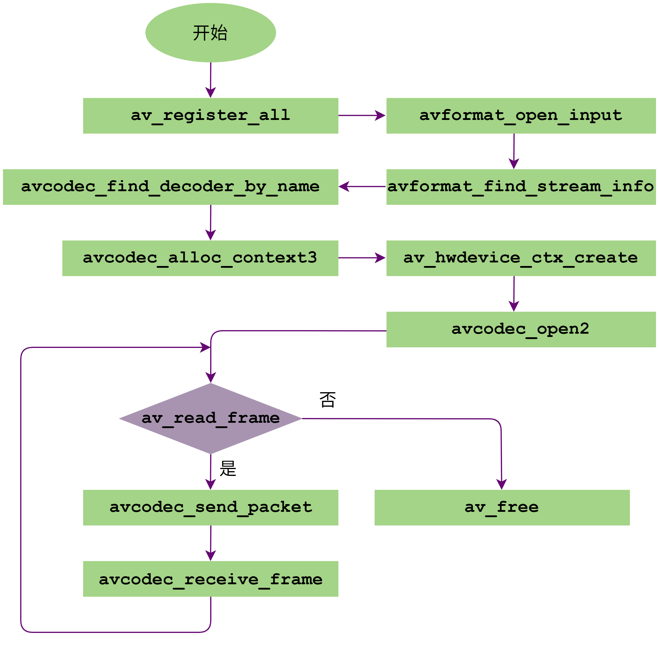avcodec_alloc_context3:获取编解码器上下文信息。av_hwdevice_ctx_create:初始化相关硬件设备,只需要输入硬件名称 mx 就可以初始化硬件设备。avcodec_open2:调用Init函数,初始化编解码。av_read_frame:获取一帧解码码流。avcodec_send_packet:发送包数据到FFmpeg解码队列中。avcodec_receive_frame:从成功解码的帧队列中获取一帧Frame数据。av_free:释放解码器。