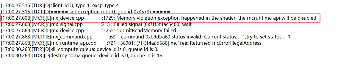 重点关注红框内给出信息,MCR层给出提示信息 [MCR][E]mx_device.cpp:1729:Memory violation exception happened in the shader, mcruntime api will be disabled 并设置了 g_final_error,对应异常类型来看:核函数触发了异常类型 3—Memory violation,对照触发异常条件可以知道,我们的核函数代码可能存在访问内存的偏移量小于0,越界或数据未按要求对齐。