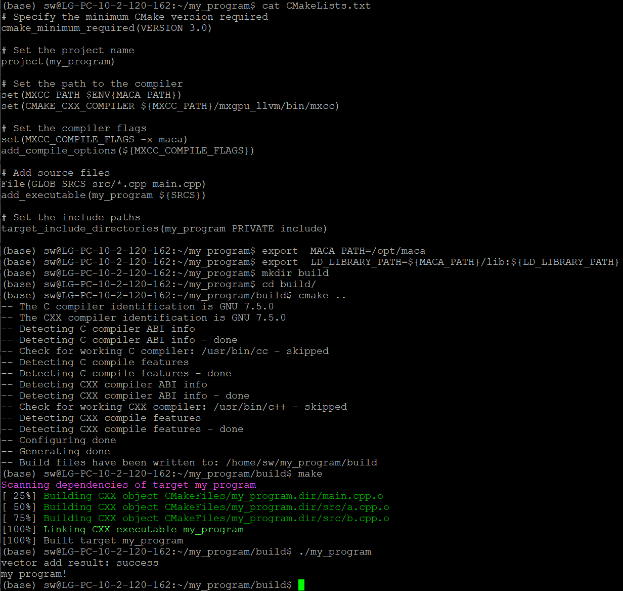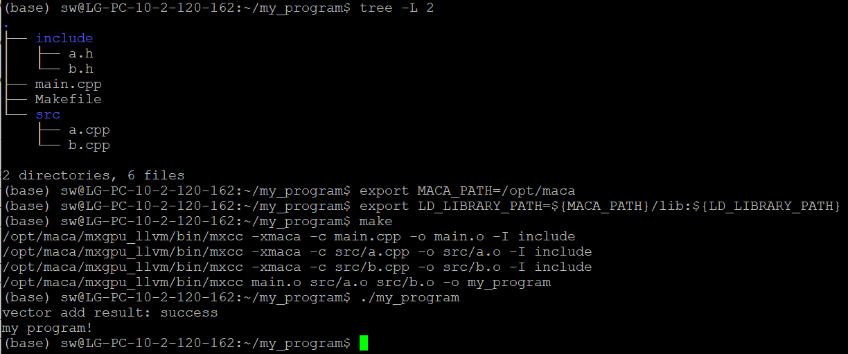 然后在Makefile同级目录下执行 make 命令,如图 4.2 所示,就能得到可执行程序my_program。该工程中,源文件a.cpp例举了一种利用核函数实现向量加法的典型用法。