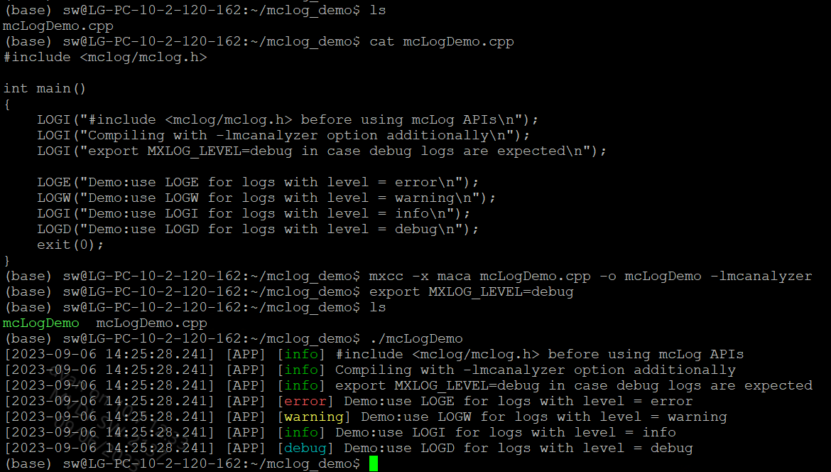 mcLogAPI之前,需要include它的头文件,mxlog.h 位于MXMACA软件包成功安装后 include 目录的子目录 mxlog;根据应用程序对于日志等级的定义,选用相应的