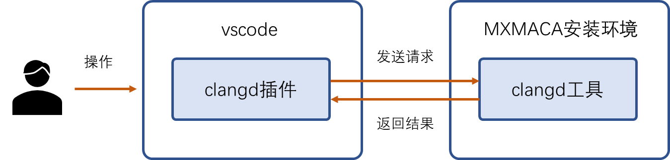 如下图所示,在安装了VSCode插件和MXMACA的环境中,用户通过VSCode执行某个功能,Clangd插件发送对应的消息到Clangd工具,Clangd工具处理后,将处理结果再通过消息返回给Clangd插件,经由VSCode显示给用户。