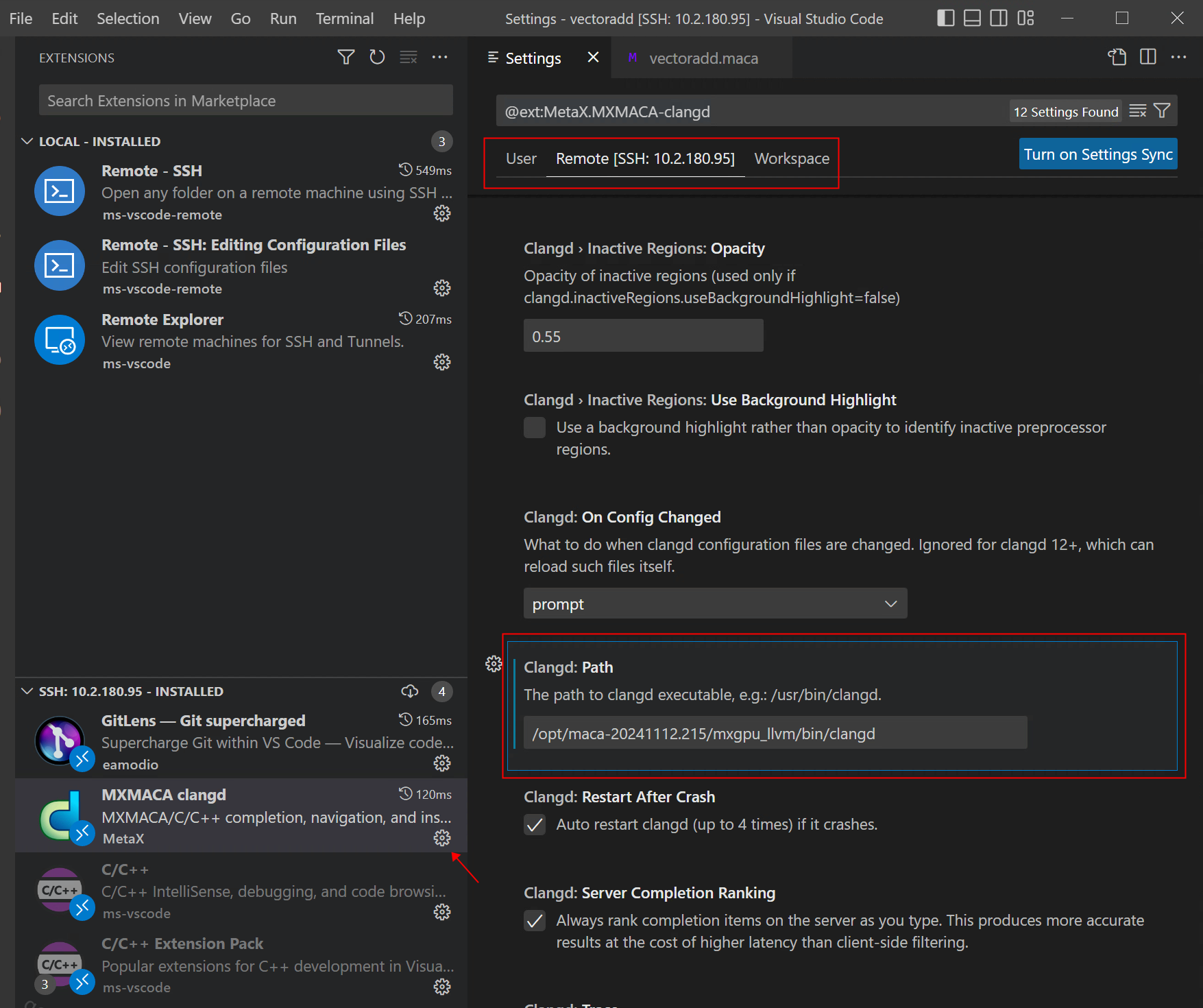 如果需要用其他MXMACA目录下的Clangd,可以在Clangd插件中设置对应路径。如图 5.1 所示,点击Clangd插件配置按钮