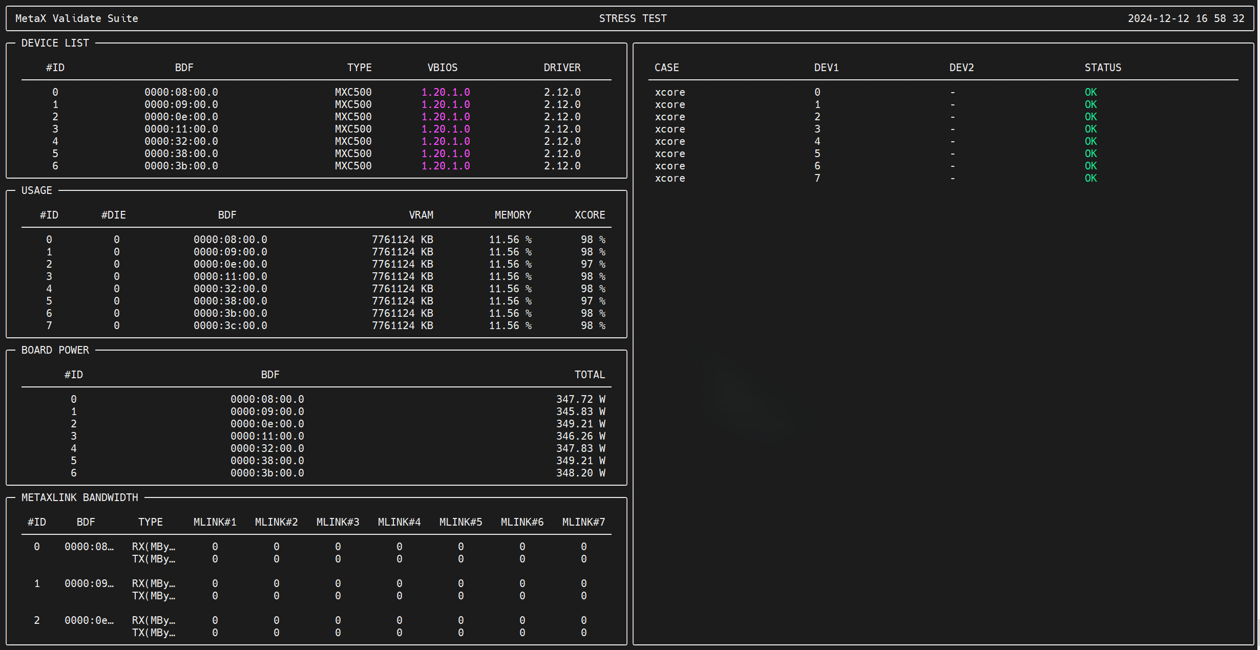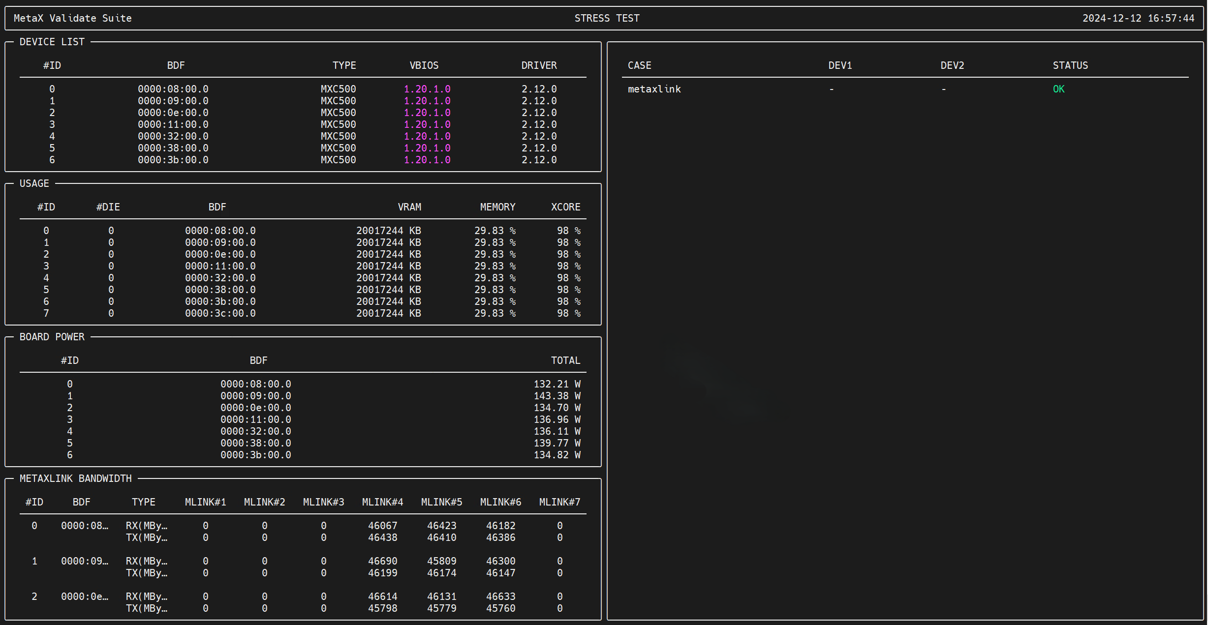 选择要在压力测试面板中展示的内容,默认显示以下几项: 0:BOARD POWER(功耗) 2:USAGE(使用率) 3:METAXLINK BANDWIDTH(MetaXLink 带宽) |