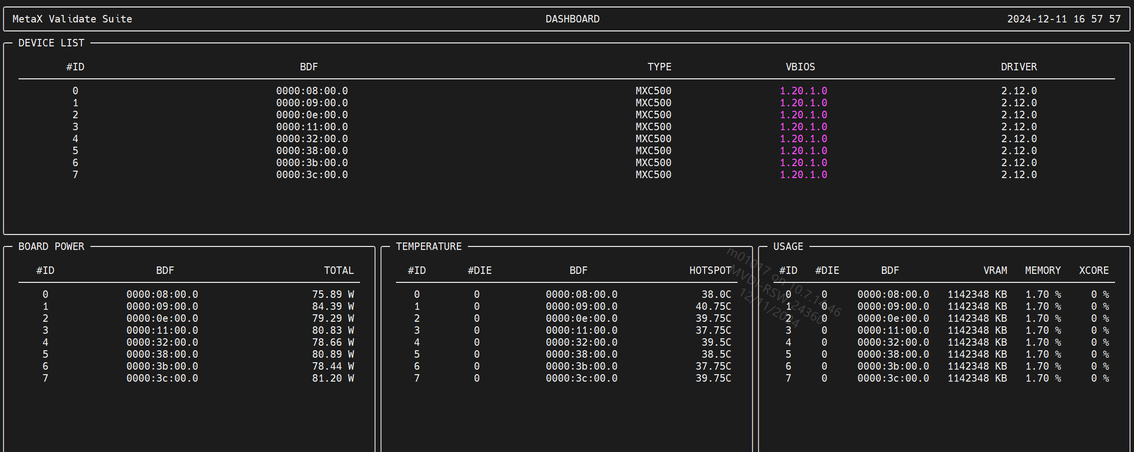 例如,仅显示设备0和设备1的USAGE、HBM BANDWIDTH及PCIE BANDWIDTH状态: |