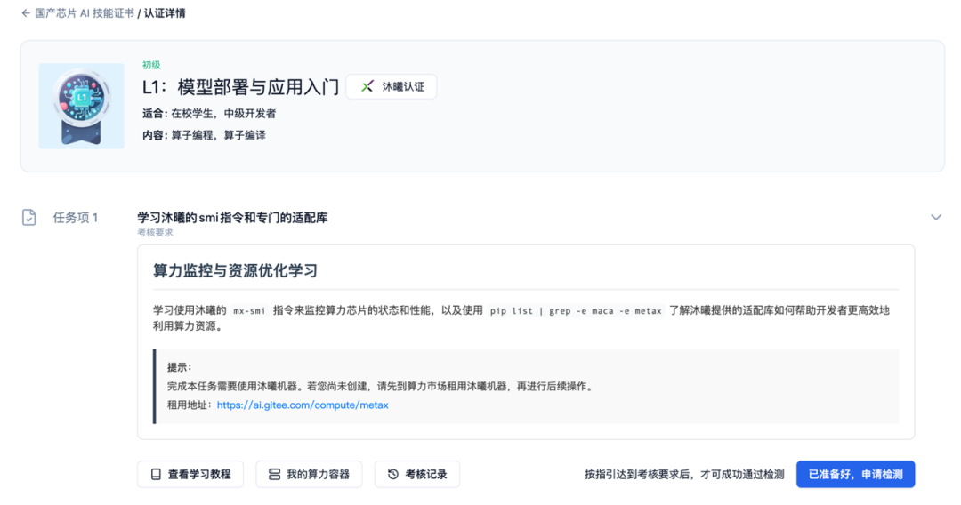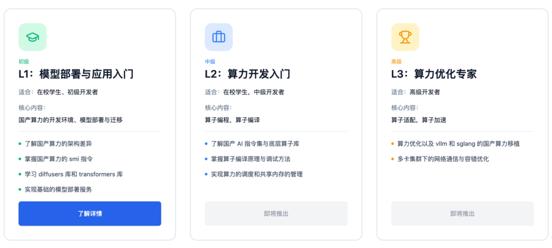 初级 L1「模型部署与应用入门」,面向在校学生和初级开发者,核心内容为国产算力的开发环境搭建、模型部署与迁移,当前已开放报名。
