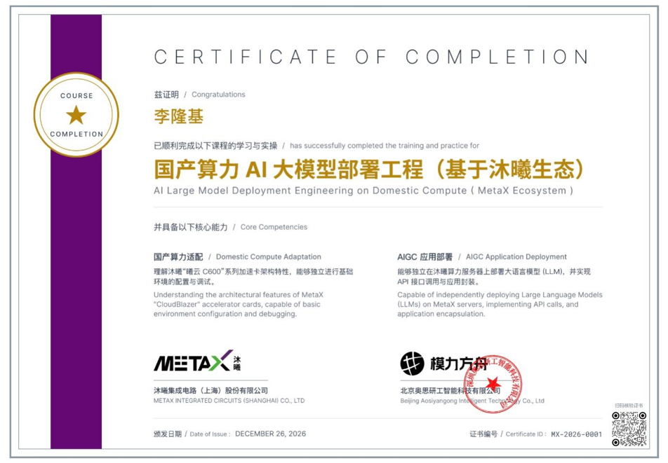 官方权威背书:证书由沐曦股份与模力方舟联合签发并加盖公章,支持在线核验,是国产算力与信创生态的官方能力证明。